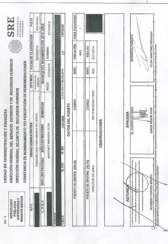 El documento específico al que se refiere la dependencia que encabeza Esteban Moctezuma es el certificado que entregó Martínez Miranda a Relaciones Exteriores para asumir su cargo, por el cual le han pagado un sueldo bruto mensual de 122 mil 930 pesos cuando ingresó, y que se ha reducido a 81 mil 919 pesos por la austeridad republicana (de acuerdo con la respuesta a la solicitud de información pública 0000500033620).
