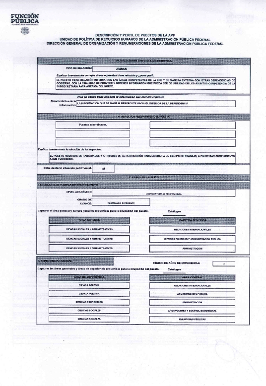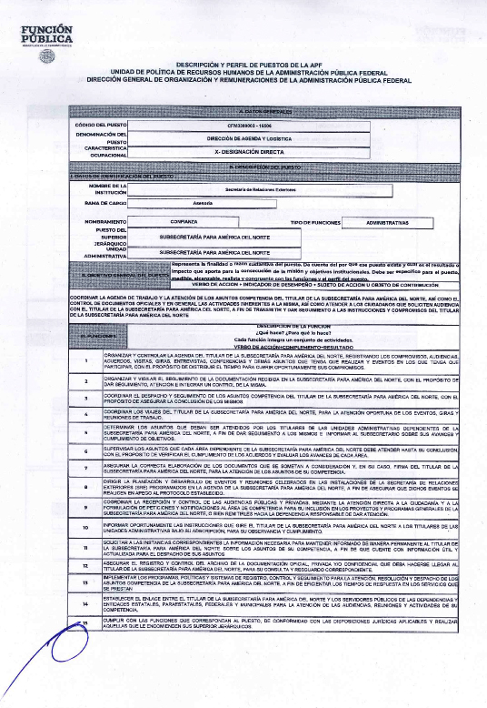 En este se expone la “descripción y perfil” del puesto, así como sus funciones generales como jefa de la Oficina de Seade Kuri. Éstas son: “coordinar la agenda de trabajo y la atención de los asuntos competencia del titular de la Subsecretaría para América del Norte, así como el control de documentos oficiales y en general las actividades inherentes a la misma, así como atender a los ciudadanos que soliciten audiencia con el titular de la Subsecretaría para América del Norte, a fin de transmitir y dar seguimiento a las instrucciones y compromisos del titular”.