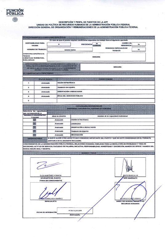 En los archivos de la Función Pública su nombramiento “de confianza” –con código de puesto CFM33000003-16506– requiere un nivel académico de licenciatura o profesional, con un grado de avance terminado o pasante. El documento –también obtenido por medio de la Ley General de Transparencia: solicitud 0000500063520– fue firmado por la propia Olga Martínez Miranda en su calidad de “ocupante del puesto”, y por otros tres servidores públicos el 1 de julio de 2019.