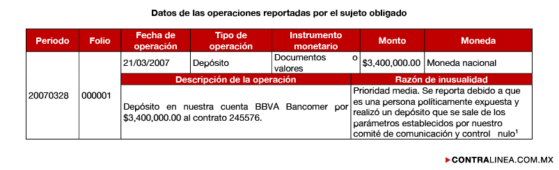 De acuerdo con la información proporcionada a la UIF por Vector Casa de Bolsa, “la transaccionalidad del cliente es incongruente con el conocimiento que se tiene del mismo, toda vez que realizó un depósito por $3’400,000.00 M.N. [sic] con documentos o valores. La institución financiera lo reportó por ser una Persona Políticamente Expuesta y por la operación de depósito que se sale de los parámetros establecidos por el comité de comunicación y control de dicha institución”.