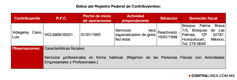 El expediente UIF/SAT/2577/2009 establece haber localizado en el Registro Federal de Contribuyentes con clave VICL680810SG1, fecha de inicio de operaciones 1 de enero de 1993, actividad preponderante “Servicios Técnicos Especializados de Gobiernos Federal y Estatal”, localizándose declaraciones anuales con ingresos acumulables como a continuación se detalla: año 2002, 1 millón 949 mil 35 pesos; 2003, 5 millones 439 mil 621 pesos; 2004, 5 millones 29 mil 485 pesos; 2005, 13 millones 650 mil 288 pesos; 2006, 1 millón 978 mil 699 pesos; 2007, 2 millones 105 mil 365 pesos.