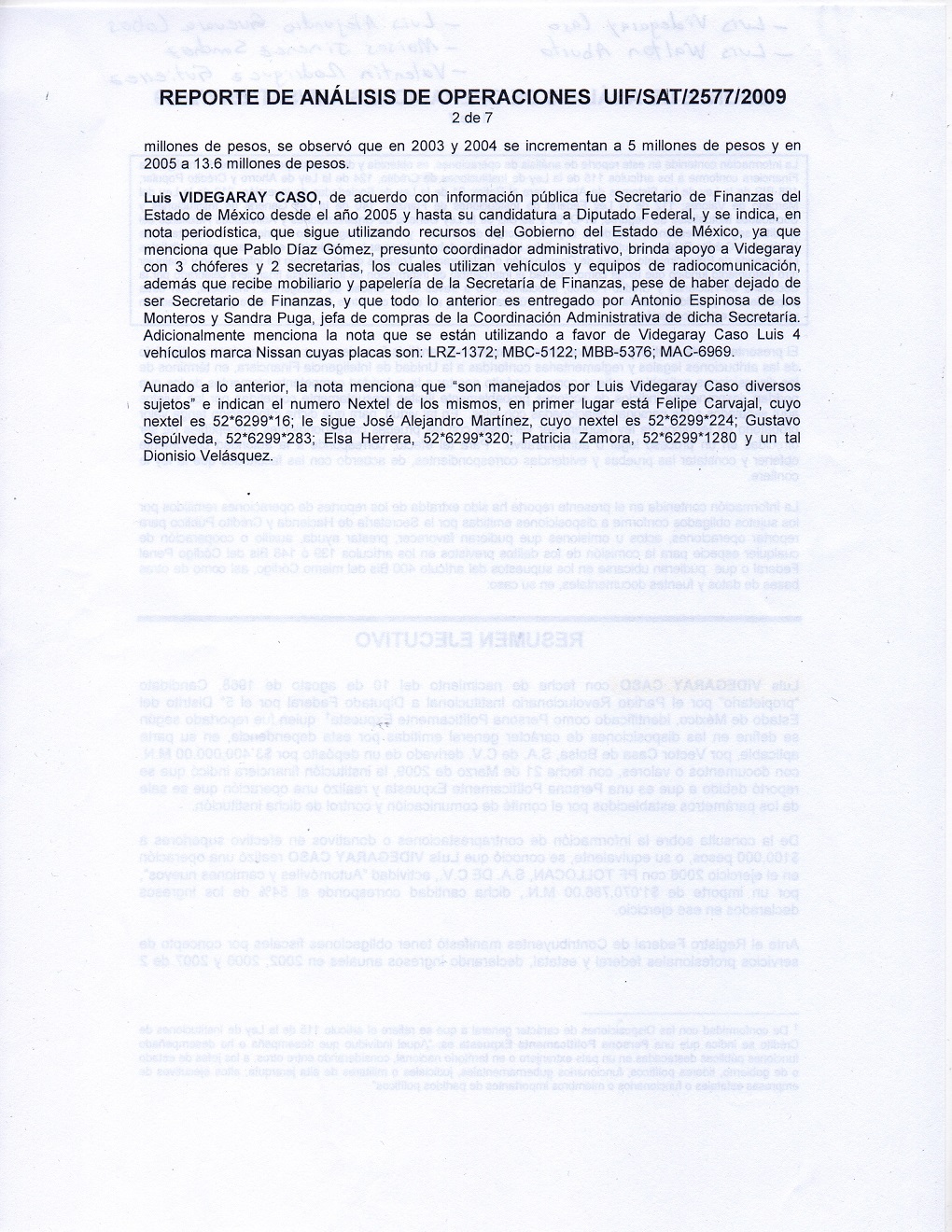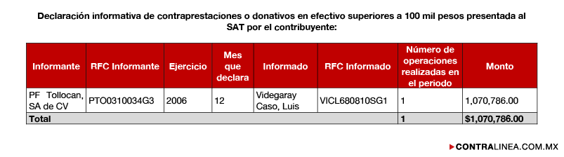 Dicho reporte elaborado por la UIF con información del Servicio de Administración Tributaria (SAT), precisa que de la consulta sobre la información de contraprestaciones o donativos en efectivo superiores a 100 mil pesos o su equivalente, se conoció que Videgaray Caso realizó una operación en el ejercicio 2006 que llamó la atención de las autoridades, con la distribuidora de automóviles PF Tollocan, SA de CV, por un importe de 1 millón 70 mil 786 pesos, cantidad que corresponde al 54 por ciento de los ingresos declarados en ese ejercicio por el entonces secretario de Finanzas del gobierno mexiquense.