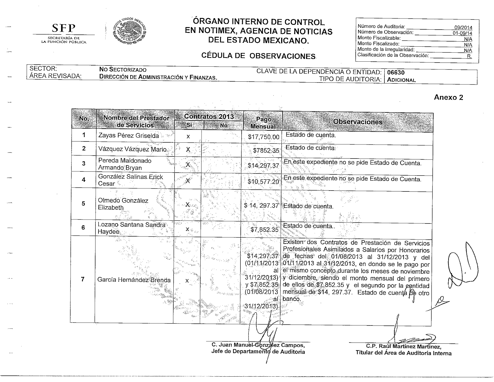 Agregaba que en el caso dos corresponsales de Madrid, éstos extendían recibo de honorarios con el mismo domicilio fiscal: “la C. Adela Mac Swiney González y el C. Carlos Federico Mesa Peraza, mensualmente extienden recibos de honorarios con el mismo domicilio fiscal en la Ciudad de Mérida, Yucatán, y debido de que a estas dos personas no se les retiene el 25 por ciento del ISR, el cálculo de impuestos de su pago incluye el 16 por ciento de IVA con retención del 10 por ciento de ISR e IVA. A la mayoría de los corresponsales en el extranjero se les retiene el 25 por ciento del impuesto sobre la renta, el cual es declarado por la entidad mensualmente al SAT, sin tomar en consideración que pueda estarse presentando una doble tributación principalmente cuando el prestador de servicios es originario del país en donde presta sus servicios para la Agencia”.