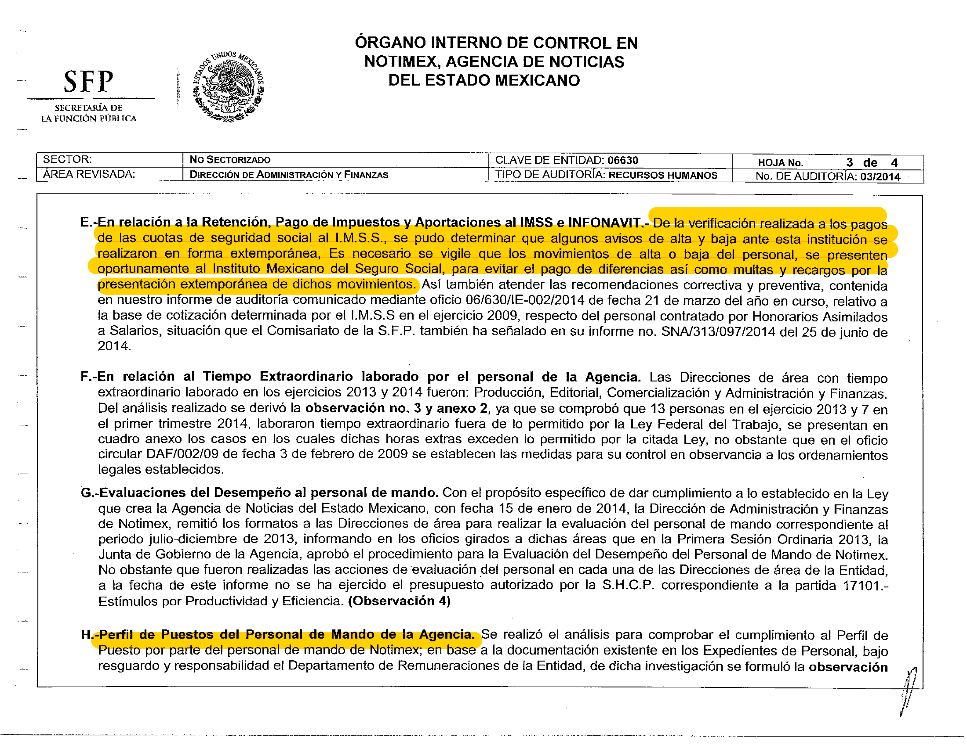 Otra anomalía detectada por la SFP fue que en ese ejercicio la Agencia no pagó impuestos. En la auditoría 06/2017 se señala: “la entidad en su carácter de retenedor no realizó el entero del impuesto sobre la renta anual correspondiente al ejercicio 2016, aún y cuando ésta contó con personal subordinado afecto al cálculo y entero del impuesto antes referido, emitiéndose la observación correspondiente”.