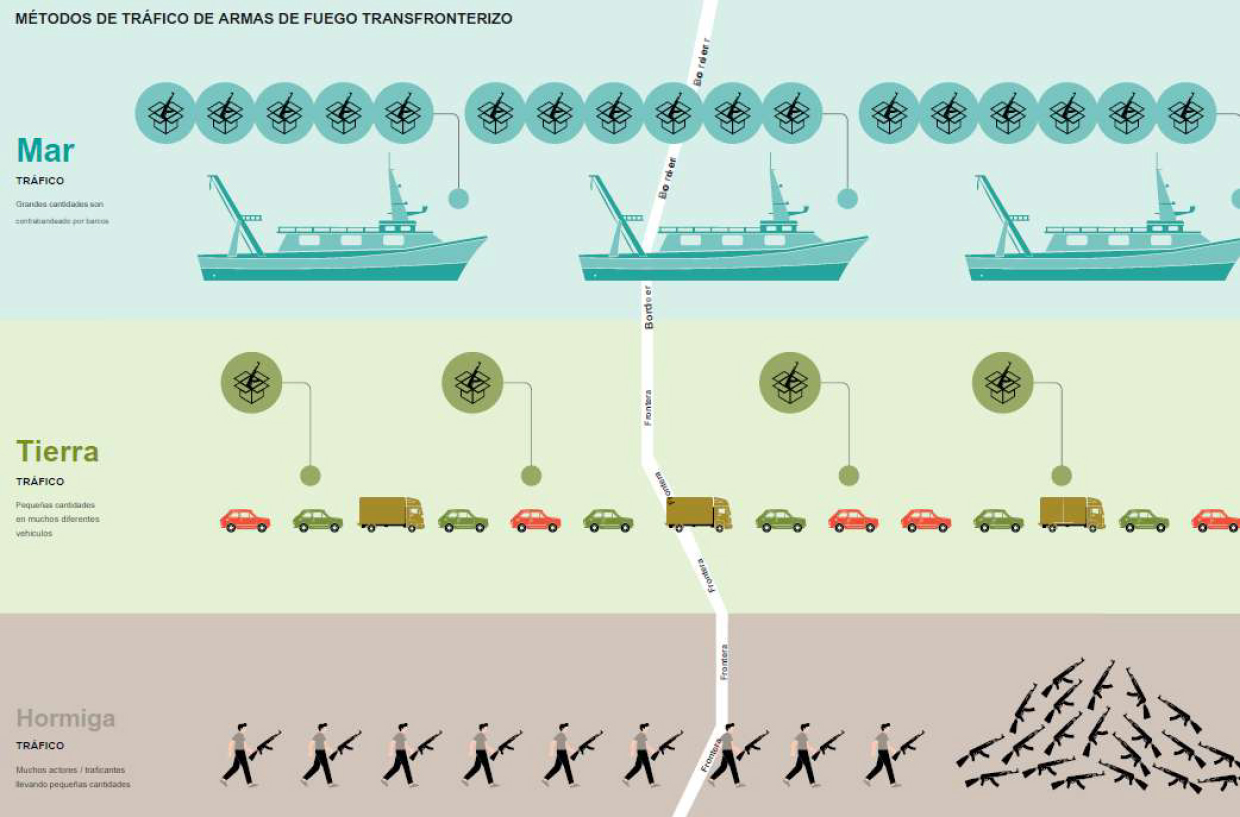 El tráfico hormiga de armas de fuego de Estados Unidos a México de organizaciones criminales resulta en flujos considerables y acumulación, como resultado de una estrategia organizada, de la oferta y demanda a nivel local o a escala más grande a través del uso de “mulas”, incluidos migrantes y refugiados.