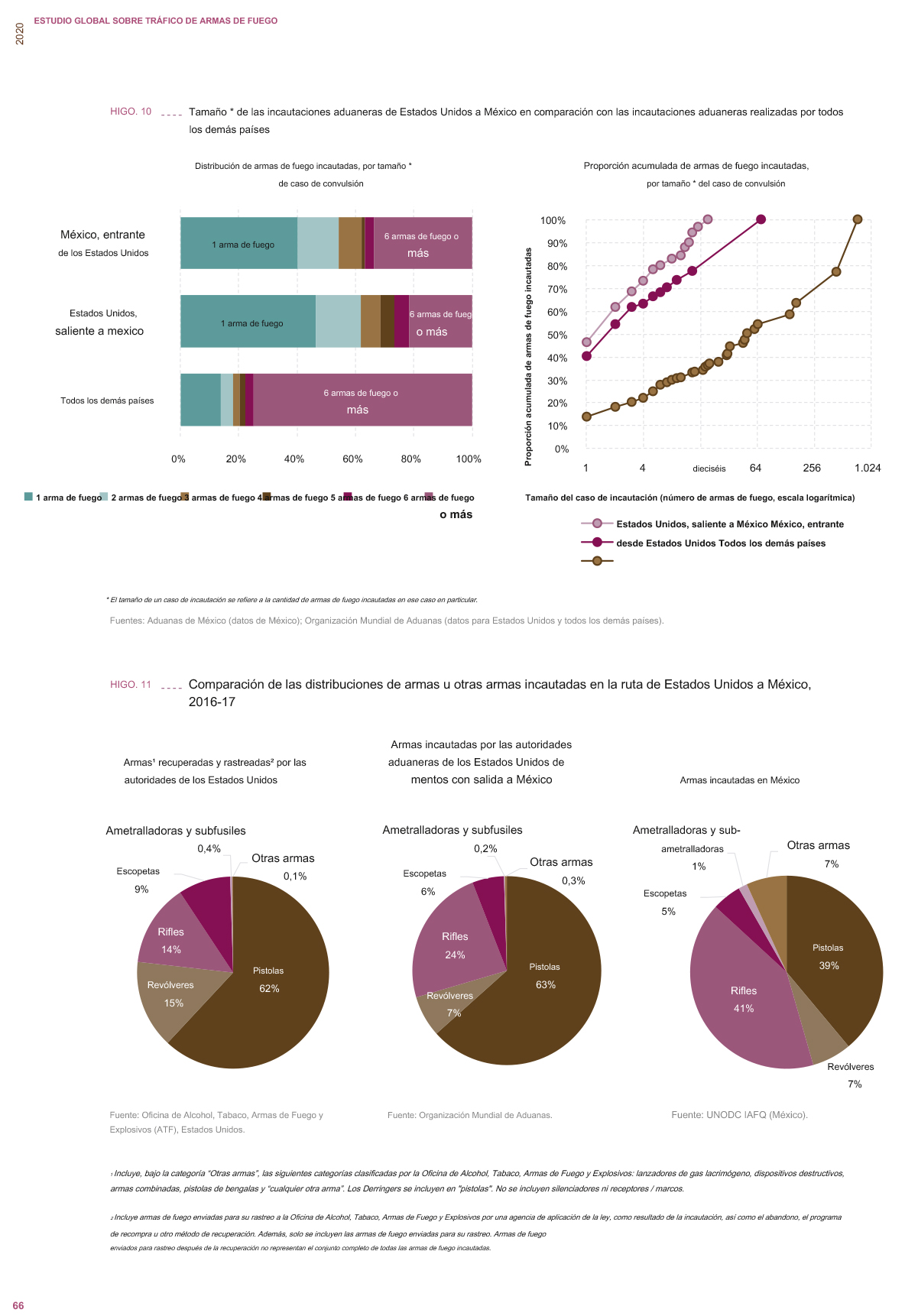 En particular, los casos de cinco armas de fuego o menos representaron dos tercios de las armas de fuego incautadas por México, al cruzar la frontera de Estados Unidos, y una proporción aún mayor (78 por ciento) de las armas de fuego incautadas por Estados Unidos en el mismo periodo en la frontera rumbo a México.