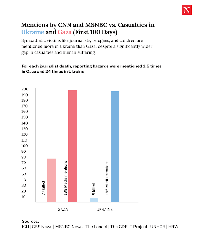 En los primeros 100 días después de que Rusia invadiera a Ucrania, murieron 262 niñ@s en Ucrania. En los primeros 100 días después del 7 de octubre de 2023, 10 mil niñ@s fueron asesinados en Gaza (la cifra real es mucho mayor). Las muertes de niñ@s en Ucrania fueron mencionadas 33.4 por ciento más. Cada niñ@ asesinado en Ucrania fue mencionado 16.1 veces, mientras que cada niñ@ asesinado en Gaza fue mencionado 0.36 veces. Asimismo, hubo 77 periodistas asesinados en Gaza, y ocho periodistas en Ucrania. La muerte de cada periodista en Gaza recibió 2.5 menciones, mientras que la muerte de cada periodista en Ucrania recibió 24 menciones. El 11 de octubre, el número oficial de muertos en Gaza había superado el número de muertos en el ataque del 7 de octubre. El 7 de noviembre, el número de asesinados palestinos pasaba los 10 mil, 70 por ciento de las víctimas fueron mujeres y niñ@s. Durante esos 30 días, CNN y MSNBC utilizaron palabras emotivas para describir la matanza de israelíes 1 mil 53 veces y la de palestinxs sólo 43 veces.