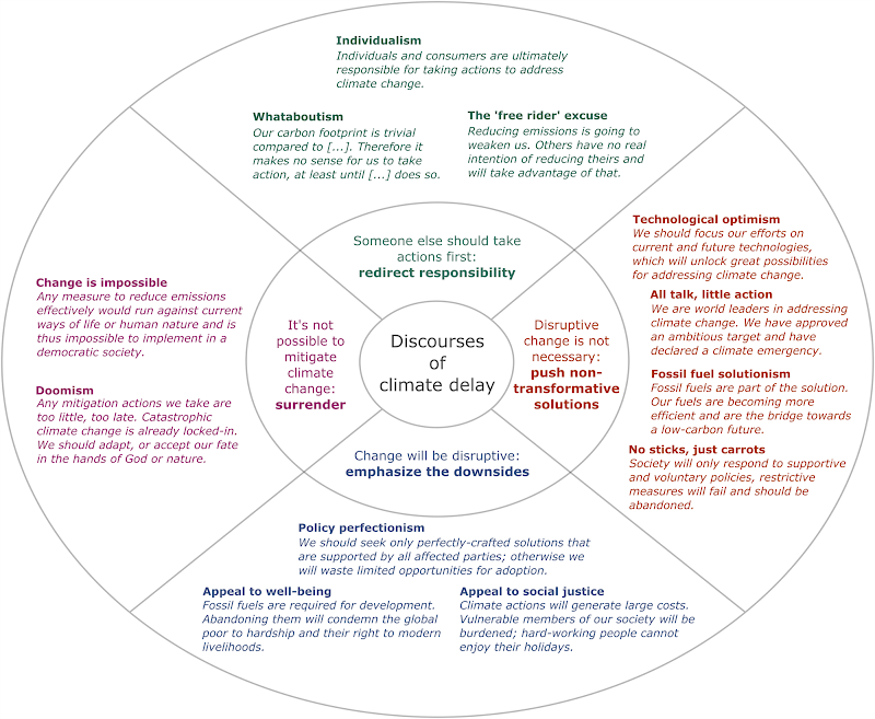 Figura 3. Narrativas típicas que bloquean cambios reales a la crisis climática. Tomado de https://www.cambridge.org/core/journals/global-sustainability/article/discourses-of-climate-delay/7B11B722E3E3454BB6212378E32985A7